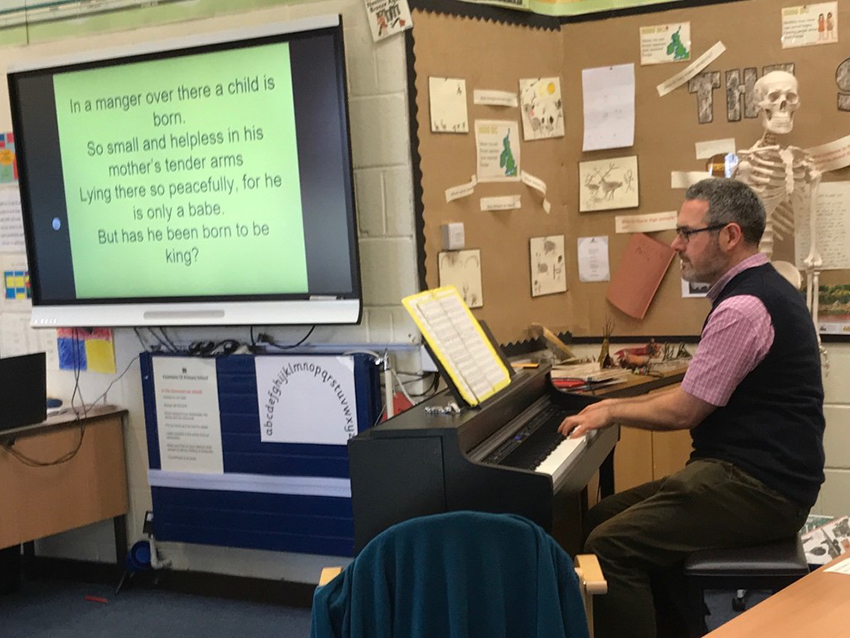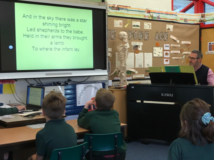 Traditional Carols of ‘O come all ye faithful’ and ‘O little town of Bethlehem’ were taught and the backing tracks, as well as the Powerpoint slides with words, were used in each school to great effect.